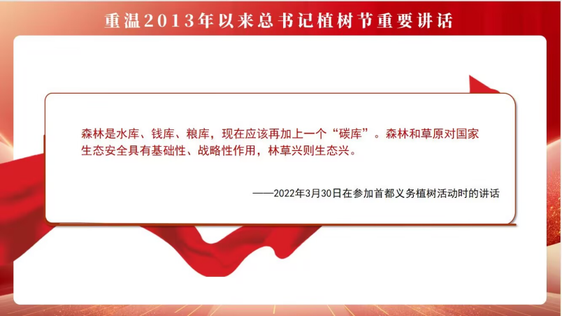 会议第二项,张吉宁老师带领大家重温了自2013年以来总书记植树节活动的重要讲话,张吉宁指出,“生态兴则文明兴,生态衰则文明衰”,人民的生活要更加美好,一个很重要的内涵就是生态环境好。新时代的青年要以习近平新时代中国特色社会主义思想为指导,深入贯彻习近平生态文明思想,学习先进榜样,牢固树立绿水青山就是金山银山理念,维护国家生态安全,构建生态文明体系,共同建设美丽中国。